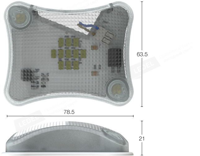 Корпус светильника состоит из 2 частей: светодиодной платы-модуля с интегрированным драйвером и поликарбонатного ударопрочного стекла-рассеивателя. Дополнительно возможна группировка нескольких светильников специальной переходной рамкой по принципу обычных розеток.