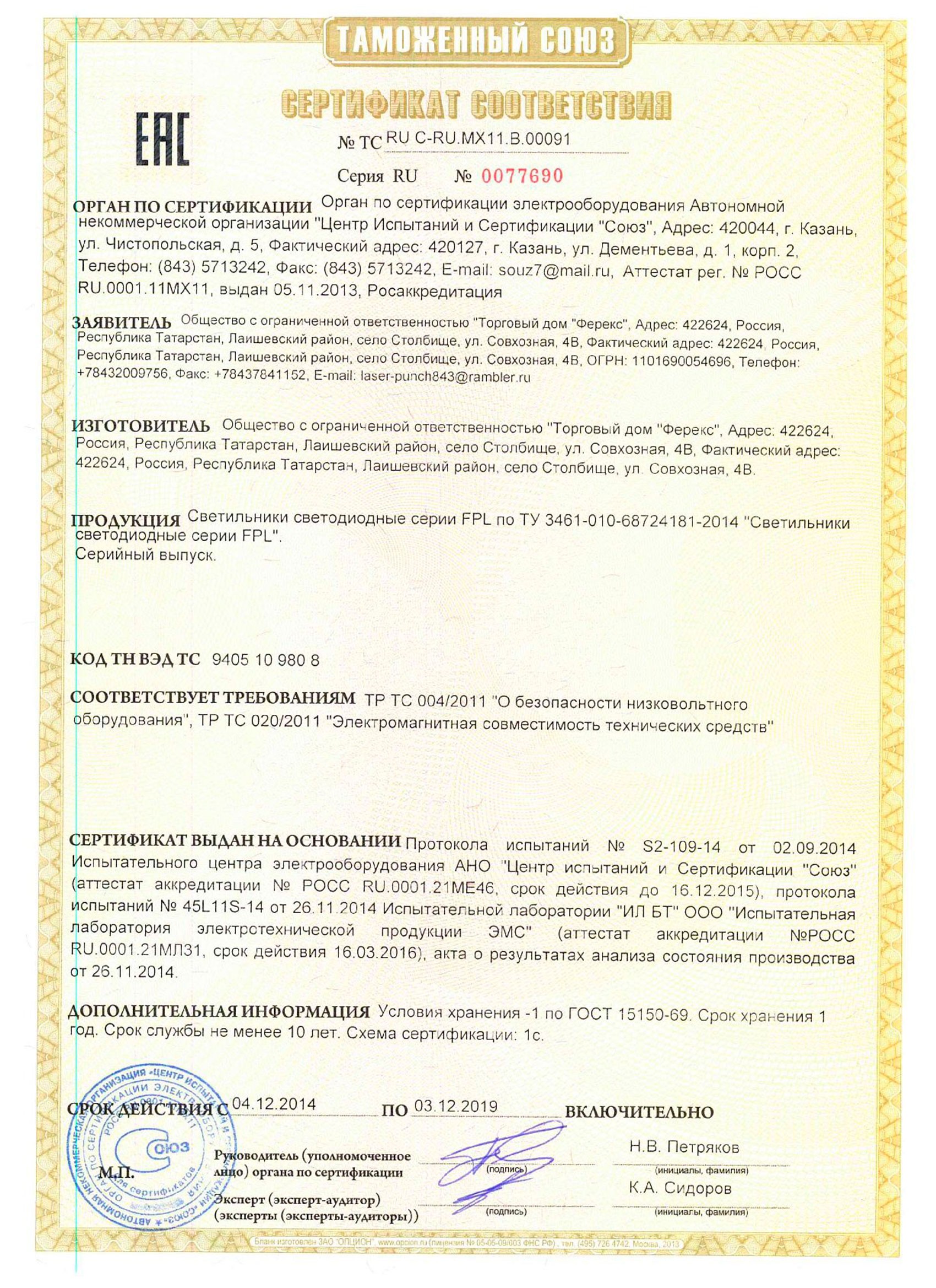 Сертификат таможенного союза на светильник FLT, FTN, прожектор FFL