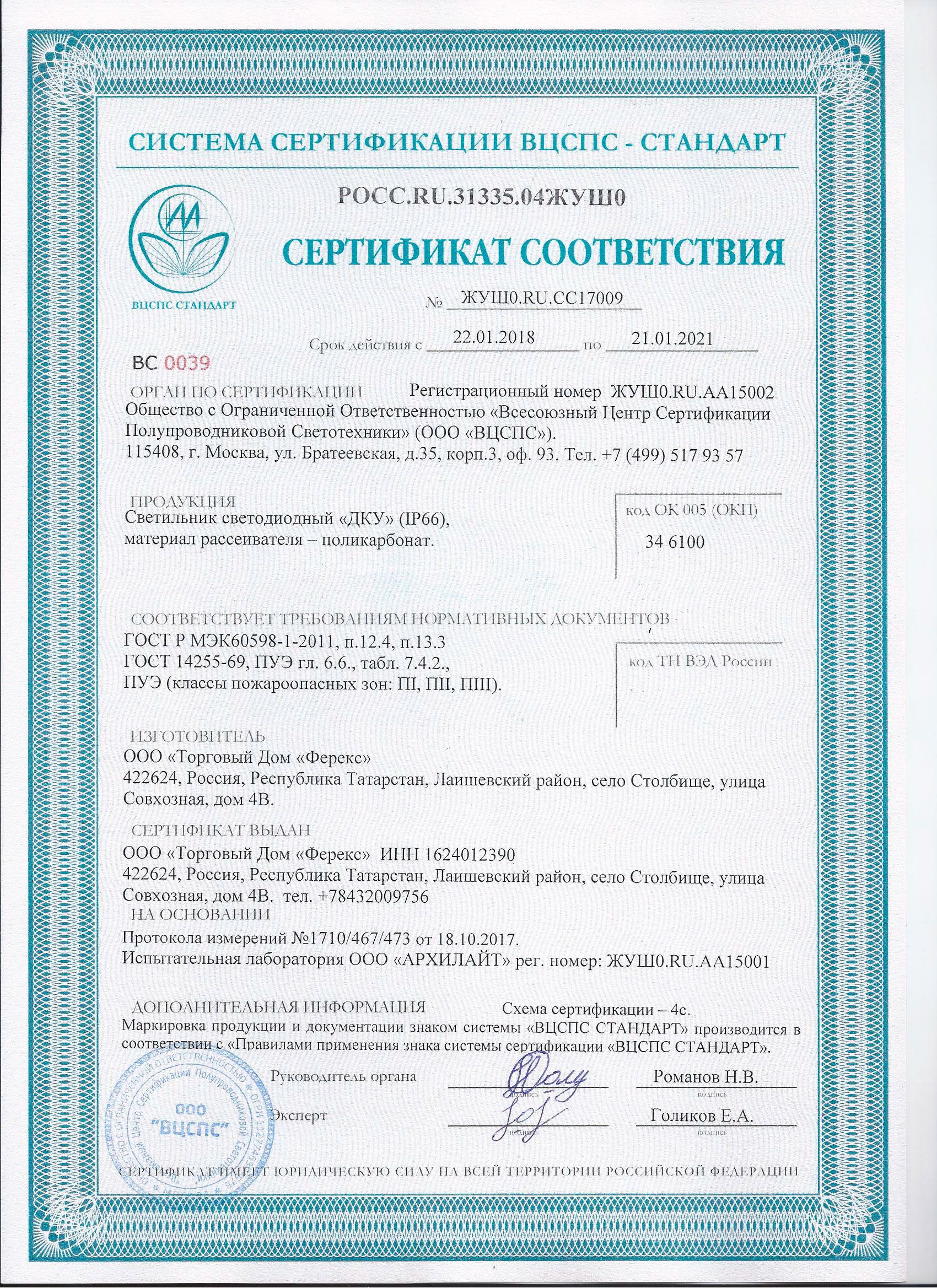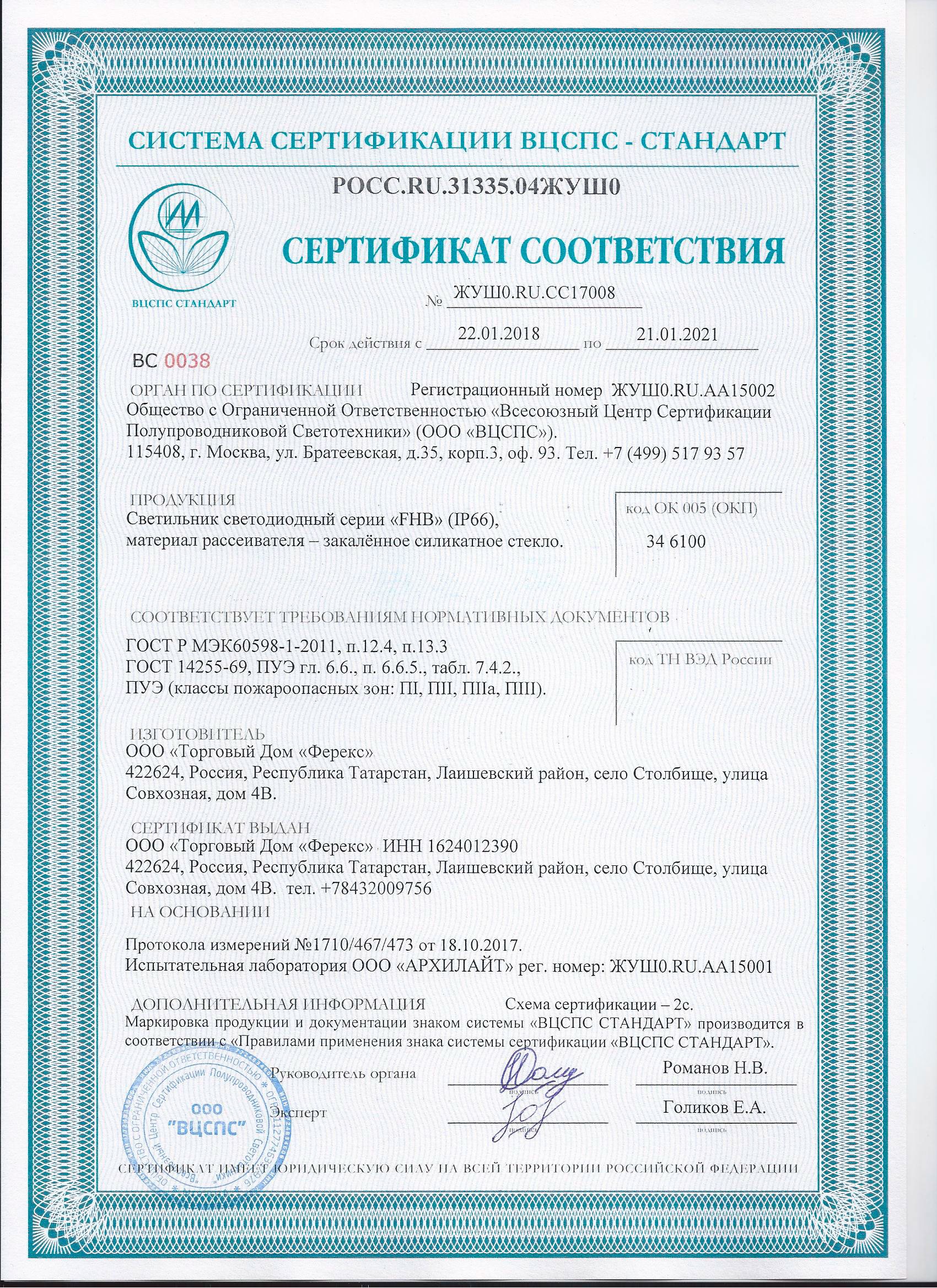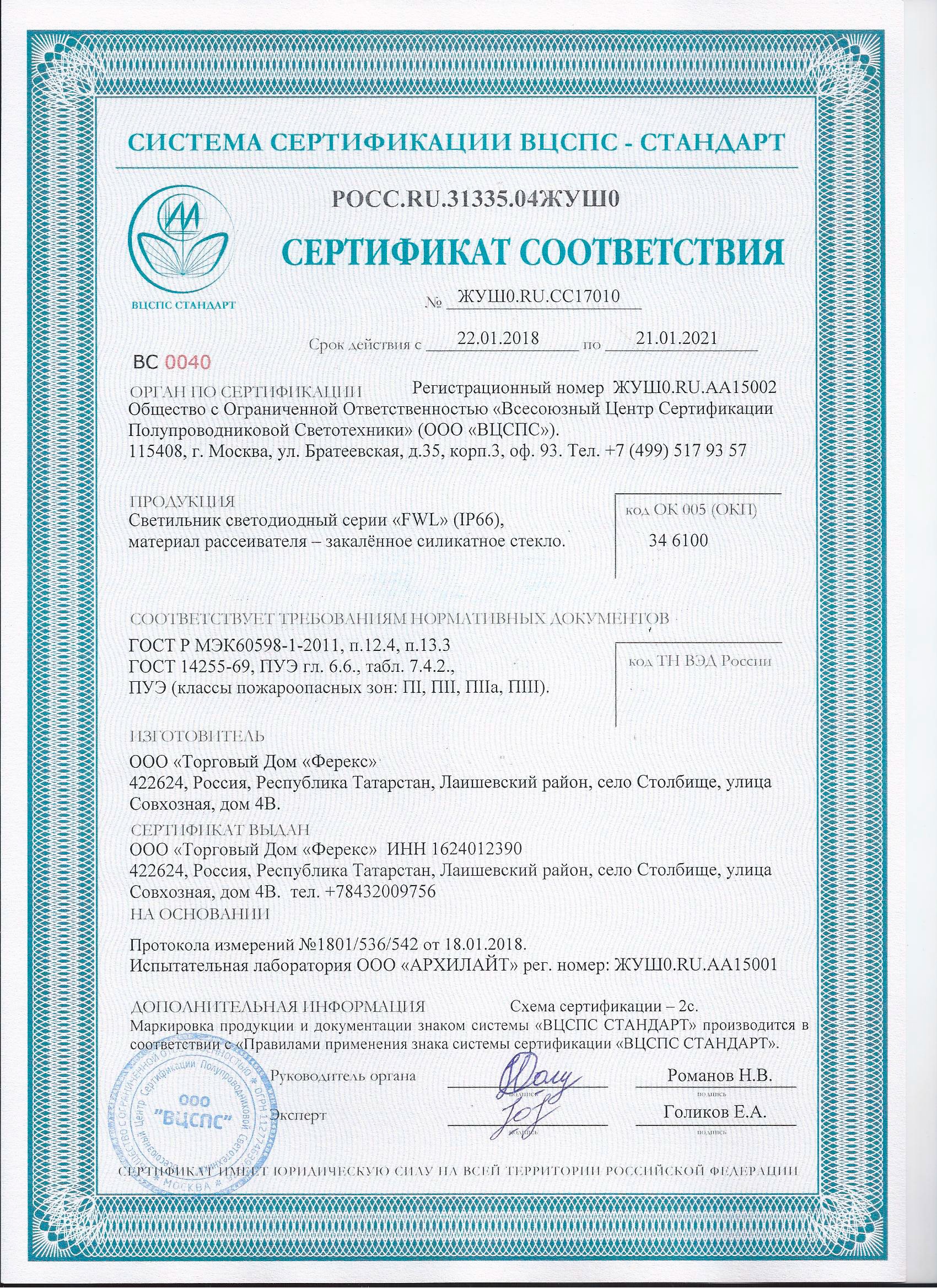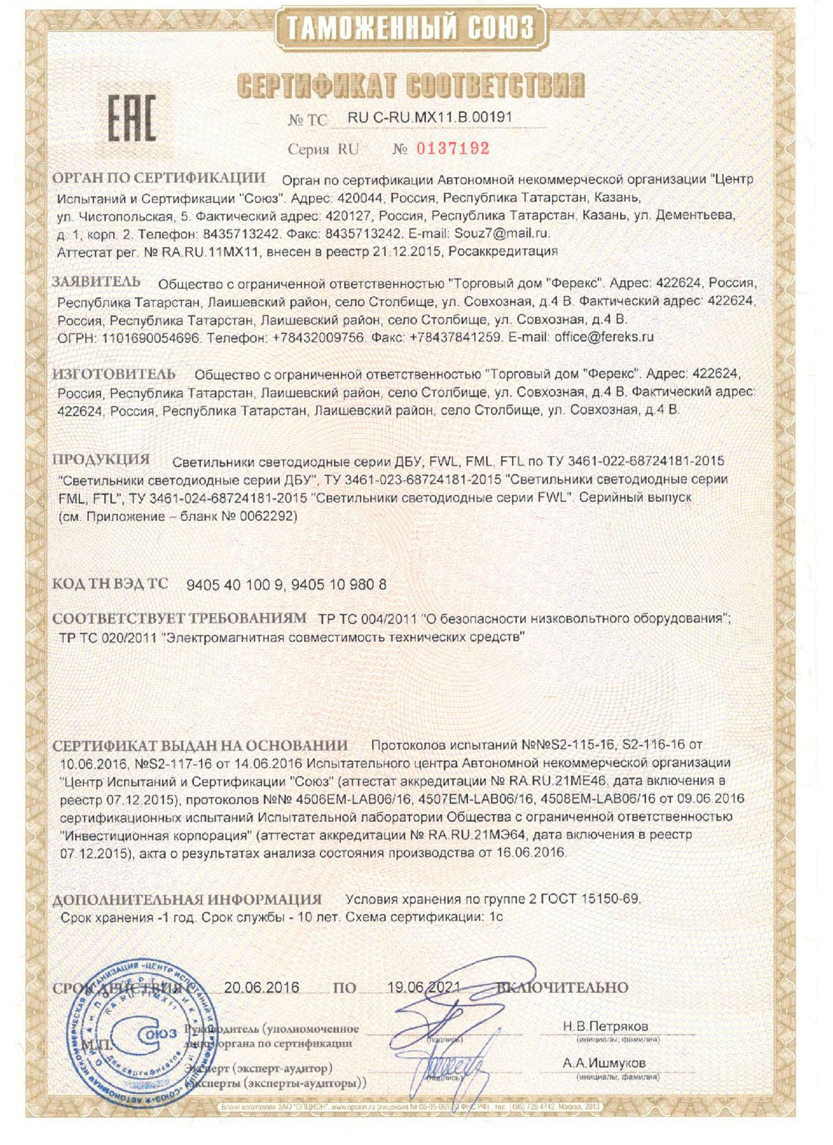 Сертификат таможенного союза на светильники ДБУ, FWL, FML, FTL
