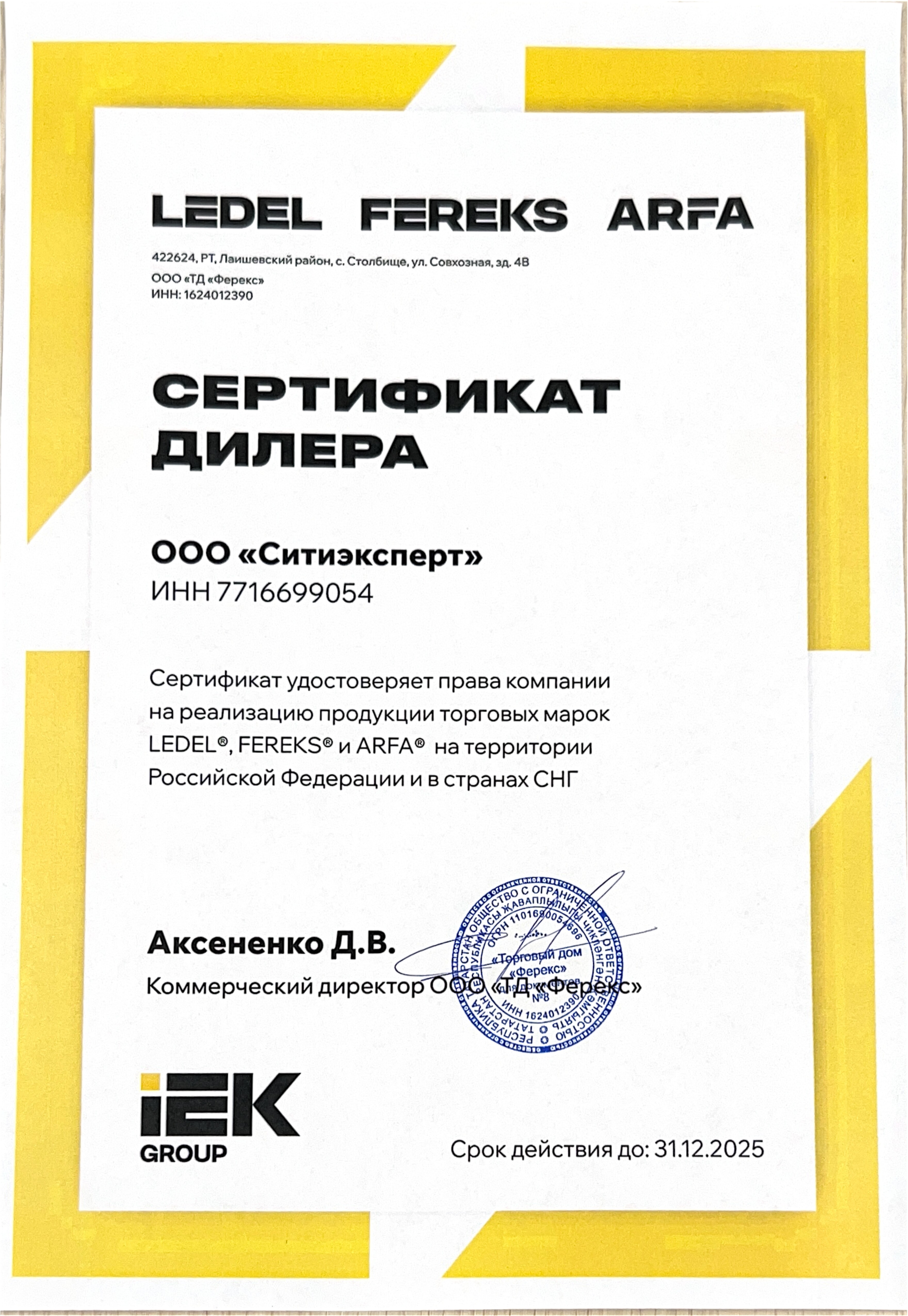 Сертификат официального дилера LEDEL FEREKS ARFA