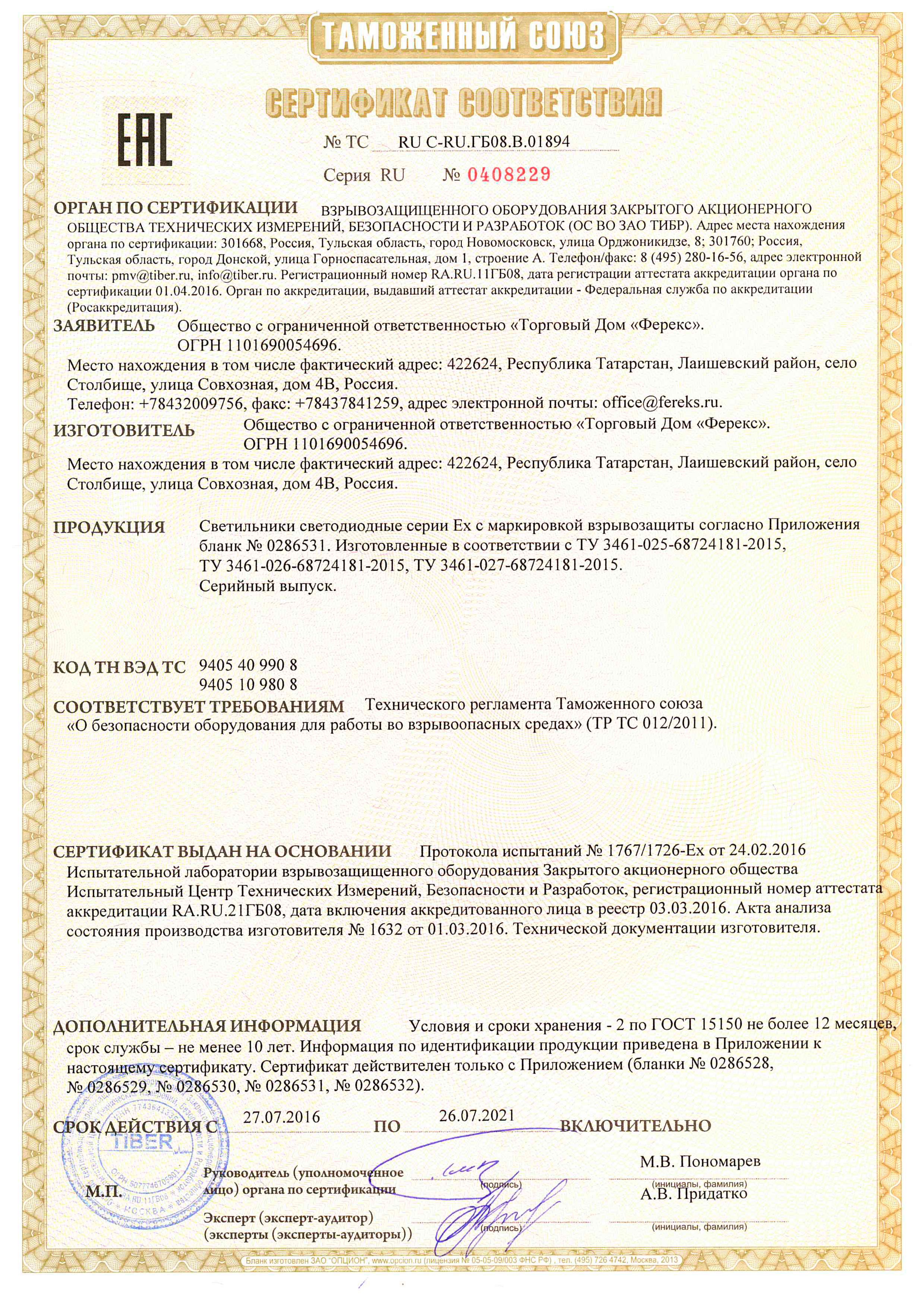 Сертификат таможенного союза на светильник Ex-ДКУ, Ex-ДВУ, Ex-ДСУ, Ex-ДПП, Ex-FBL, Ex-FSL, Ex-FWL, Ex-ДСО, Ex-FPL с маркировкой взрывозащиты